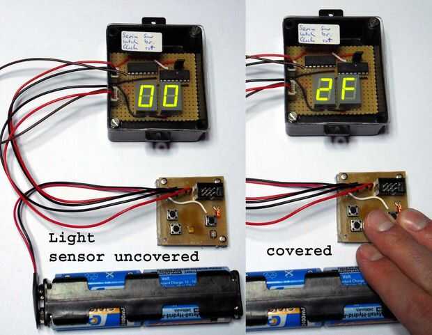 Detecté un buen valor para el cierre de la noche a alrededor de 7 d, que finalmente como límite. Cuando nos fijamos en el código, verá, que la lectura de la LDR es multiplicada por 4 y luego en comparación con el 500. El valor exacto depende de la LDR se utiliza. Usé un Perkin Elmer A905014, que tiene 3MOhm después de 5s de oscuridad y alrededor de 15kOhm 100 lux intensidad de iluminación (luz brillante).