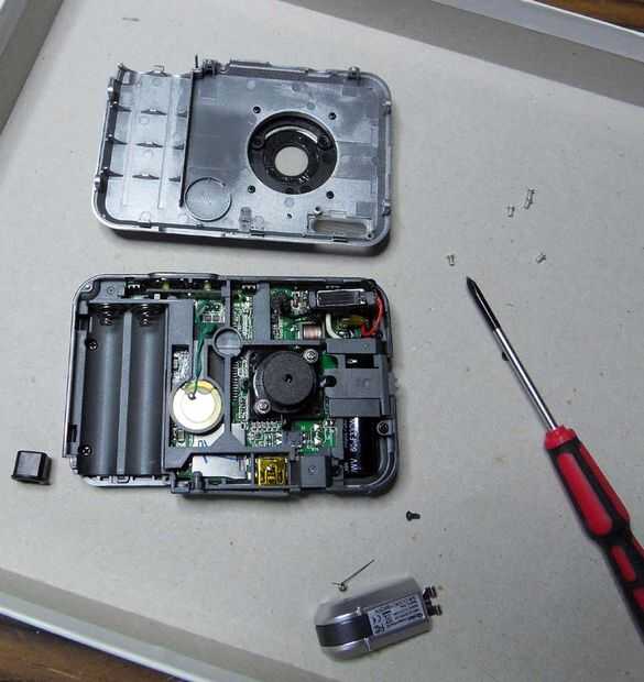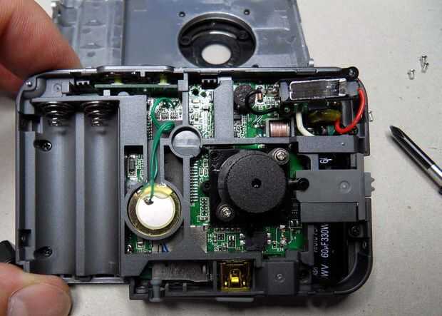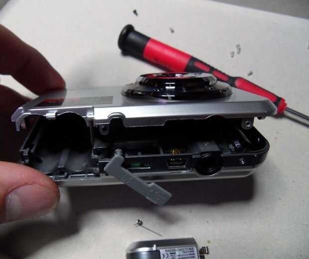 Luego levante la cubierta frontal. La luz del flash todavía está conectada a la cubierta frontal, pero se puede desenroscar con dos tornillos pequeños si usted quiere, o simplemente dejar conectada la portada no es gran cosa.