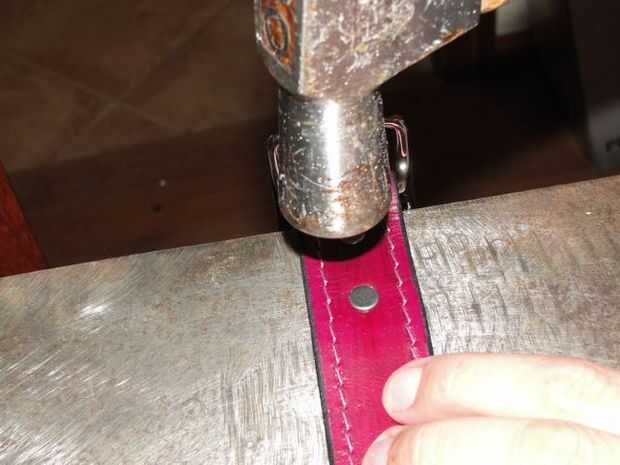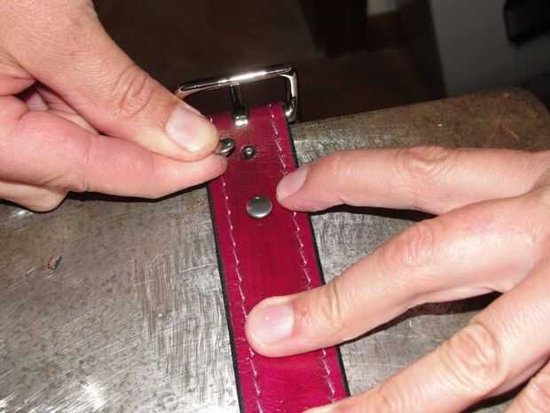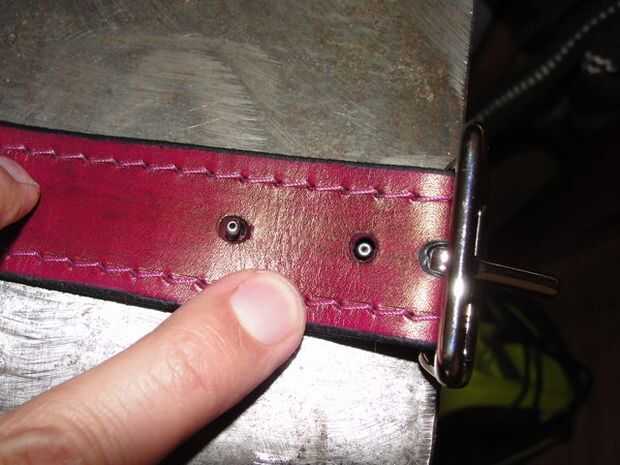 Asegúrese de que coloca la hebilla en la dirección correcta.  Generalmente es una hierba donde los golpes de lengua que el frameUsing rápida remaches fijan hebilla.  Martillo abajo lleno cuz es fácil de golpear fuera de centro y abollar el remache.