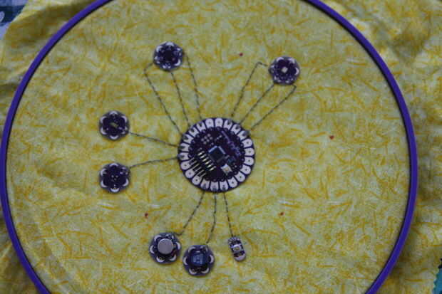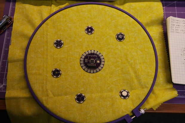 Quería exponer todas las líneas de costura, así que pensé que sería mejor utilizar la naturaleza circular de la LilyPad por separación de los componentes en un anillo alrededor de la placa principal. Después de colocar los componentes y determinando que los pernos se conectarían a los componentes, cosí todo lo útil no coser el positivo y menos líneas para alimentación de tablero principal y todos los sensores.