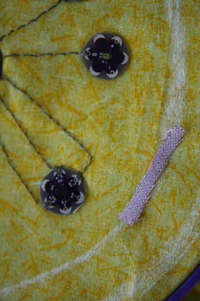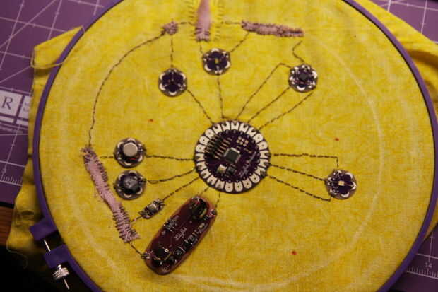 Para facilitar la costura, decidió coser dos círculos concéntricos de hilo conductor a la que podría vincular los componentes. El círculo interno es el negativo y el círculo externo es el positivo. Porque todavía estoy aprendiendo sobre estos materiales que quería probar varios tipos de materiales conductores, así como técnicas de costura. No necesito todo el lazo para ser conductora, sólo las zonas donde se ubicaron los sensores.