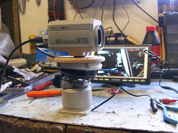 Como cambian las cosas de cualquier prototipo, la foto muestra el primer intento, esto funcionaba pero inclinando la cámara hacia arriba desde un ángulo bajo hacía el esfuerzo motor, me di cuenta de que si me enciende el Monte y motor al revés encima de él podría funcionar más fácilmente... más adelante foto mostrará la configuración final. Hizo pan tilt y zoom (PTZ).