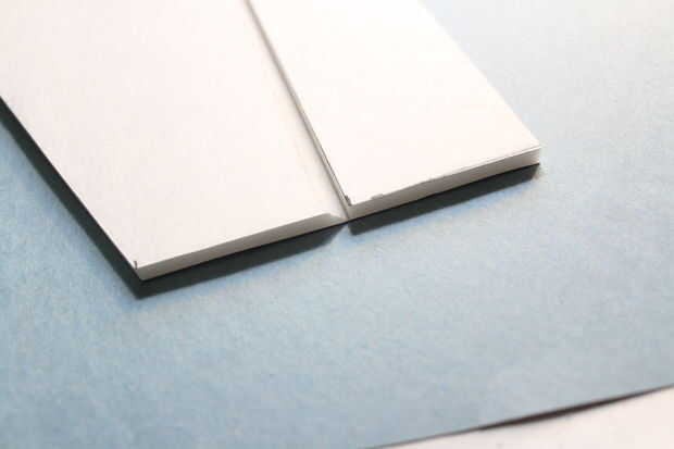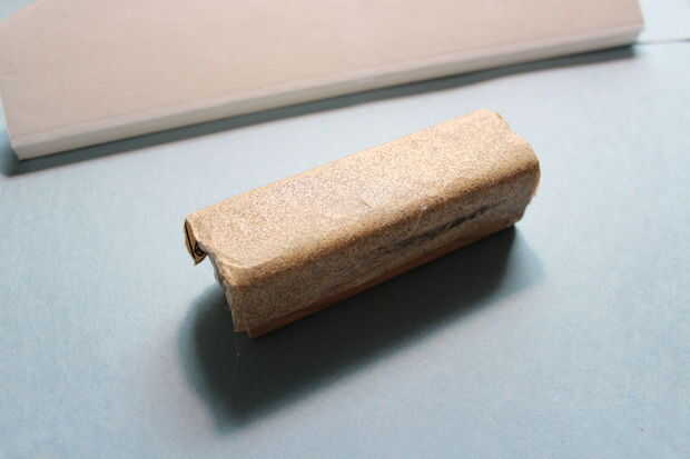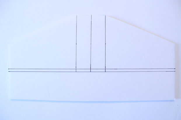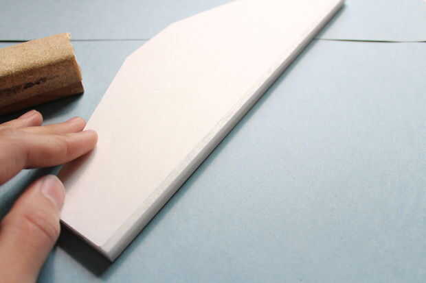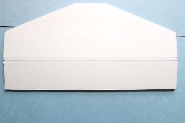 Voltear la stabilizer(elevator) horizontal boca abajo por lo que buscamos en la parte inferior. Hacer dos marcas funcionando a lo largo, en 2" y el otro en 2 3/16". En la línea en 2" será un corte de 90%, (primera capa de papel, espuma, pero no el la última capa de papel), y la línea en 2 3/16 será un corte de 10%, que es sólo la primera capa de papel, así que, básicamente, una puntuación. Luego pelar ese pequeño 3/16" tira de papel. Doblar los 2" aleta de cartón pluma, justo como en la imagen 3. Ahora tome un bloque de lijado como el de la foto 4 y empezar a arena lejos en todos la espuma en que tira de 3/16". Cuando haya terminado debe lijarse como en cuadro 5.