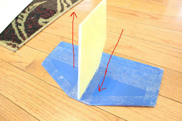 Esta parte es bastante sencilla pero es importante que usted consigue el estabilizador vertical (timón) tan recto como sea posible. Para ello encontrará una velocidad cuadrada muy cerca. Coloque el estabilizador horizontal (ascensor) sobre una mesa. La bisagra debe ser en la parte inferior, dejando la franja pelada en la parte superior. Por la zona de papel quitado en el centro del chorro de una gran franja de pegamento abajo. No se ponga pegamento en la superficie de control 2". Coloque el estabilizador vertical hacia abajo en la cola como se muestra en la figura 1. Usar un cuadrado de la velocidad para asegurarse de que está parado hasta perfectamente recto y comprobar si la está apuntando directamente y no apuntando ligeramente derecha/izquierda. Fotos de y 1 y 2 deben ayudar a entender.