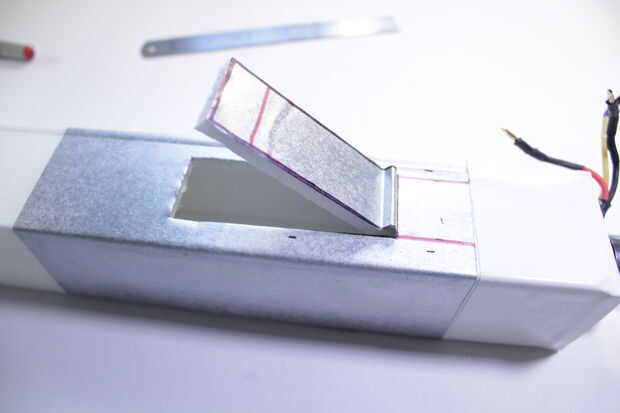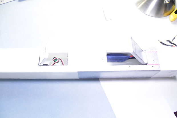 - Corte de tres aristas de la caja, dejando el borde más cercano a la parte delantera del fuselaje sin cortar. (Foto 3).