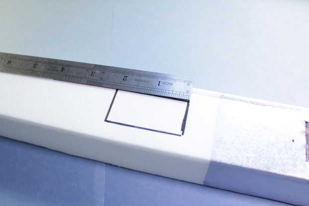 Dibujar los bordes 1/2" de los extremos del fuselaje y crear un rectángulo. Ver fotos 1 y 2.