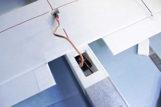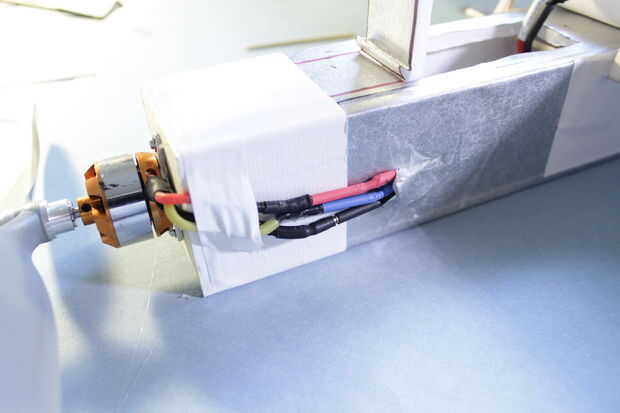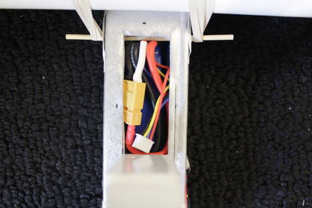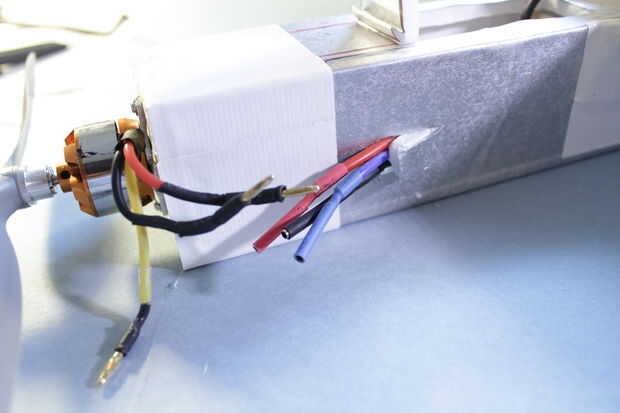 Los cables del motor deben ser apagado a un lado. Envuélvalas alrededor del borde del fuselaje como en cuadro 1. Corte un pequeño agujero en el lado del fuselaje para los cables provenientes de la ESC. Conecte los cables de la ESC y el motor juntos. No tape los cables hacia abajo todavía. Necesitamos para asegurarse de que el motor está girando el correcto primero. Haremos esto un poco más adelante.