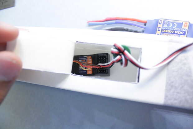En la segunda escotilla más abajo el cuerpo pone el receptor en. Usar un extensor de servo en el conductor servo de la cola, se conectan en la ranura 2 del receptor (ascensor). Consulte con el manual de su receptor para ver que lado positivo y negativo cables ir. También Conecte el servo de la ESC en la ranura 3. (foto 4).