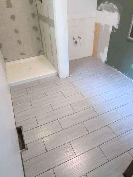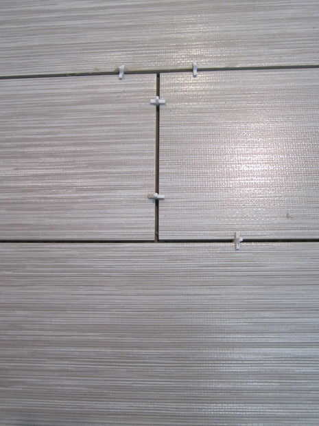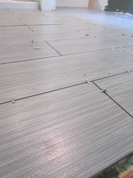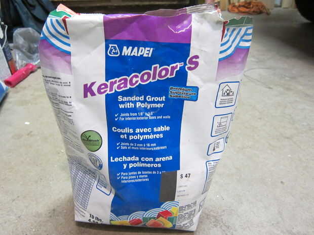 Desde que tuve una línea delgada lechada usé (Kera Color S (arena) carbón vegetal) y una paleta de lechada. Tiene una cubeta de 5 galones de agua, una esponja y una vieja toalla de mano. Lechada de aproximadamente nueve pies cuadrados en un momento pulsando en las ranuras no dejando espacio ni bolsas de aire y eliminar todo el exceso lechada como sea posible con una esponja húmeda. Asegúrese de bajar la lechada. Puede utilizar un paño seco para retirar la película que ves en el azulejo antes de que esté completamente seco.