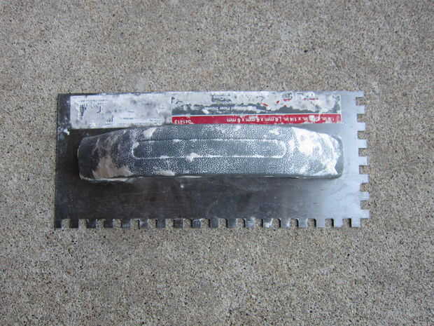 Usando una paleta de 1/4 de pulgada cuadrada extender una capa de mortero de capa delgada (yo usé Mapei) en la parte posterior de una ficha y presione en su lugar. Solía a espaciadores de 1/8 de pulgada espacio mi azulejo y ponerlos en un patrón de ladrillo.