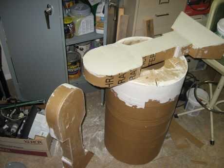 Sin embargo, el cartón tiene un no negociable la mirada de... cartón. Decidí cubrir las piernas y el cuerpo con panel de yeso común compuesto y arena plana. Engloba una serie de meteduras y protuberancias.