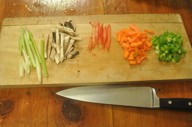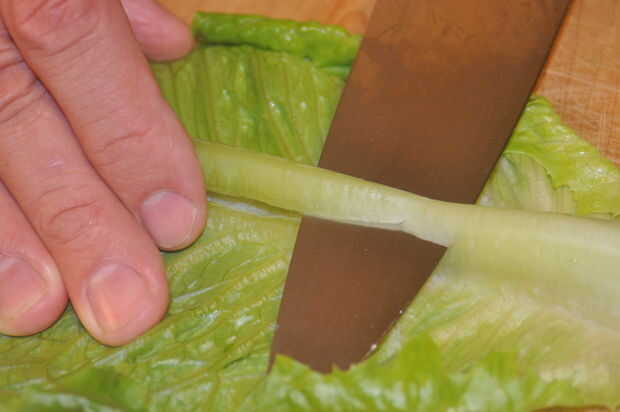 Primero, agarra todas tus bifes, un cuchillo y tabla para cortar. Hay una 'espina dorsal' (sugerencia que yo no soy un chef) en una hoja de lechuga (ver imagen). Introducir el cuchillo en él cuidadosamente y cortarlo. Luego, tomar todos sus bifes y cortarlos en trozos muy pequeños. Muy pequeño. Es importante.