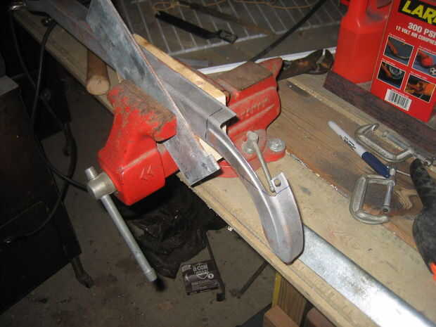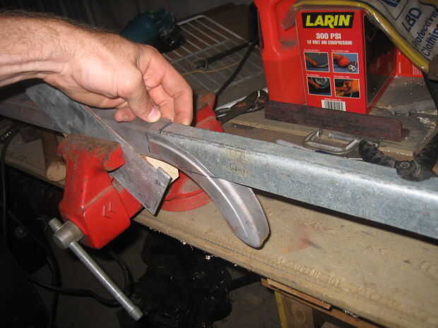 Con las protecciones instaladas, me pudo tomar algunas medidas y había hecho un plan áspero para unirlos utilizando un trozo de chapa fina de acero. Primero, determinar el ancho requerido de la pieza (incluyendo el radio de curvatura) y cortarlo. Usando un 2 x 4 como una guía de radio, doblar la pieza de relleno en la ubicación que marqué para coincidir con las protecciones originales. Luego usé una amoladora angular de 4 pulgadas para cortar una ranura en la retaguardia para permitir que la pieza de relleno para deslizarse detrás de él. Mientras que resultó, también necesarias cortar una ranura en la pieza de relleno para caber alrededor de la sección de encargo "Y" descrita en el paso 7.