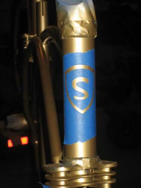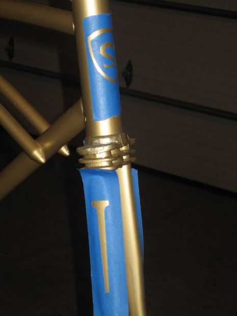 La siguiente tarea es limpiar la bicicleta. Usé algunos (wet/dry) de lija fino para limpiar el moho que se forma después de chorreo de arena. Entonces rocía todo abajo con un compresor de aire para obtener el polvo y la suciedad fuera. Es la grabación de las secciones no para pintar. Graba los soportes inferiores, los auriculares y coronas horquilla con cinta de pintor azul.