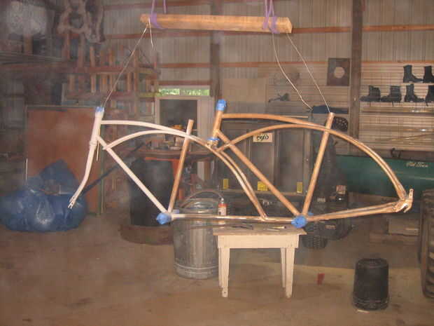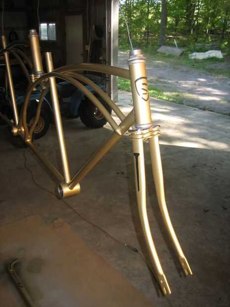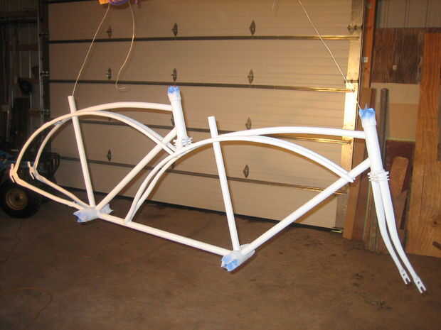 Hay mucho trabajo de preparación que se debe hacer antes de que usted nunca coger una lata de aerosol. En primer lugar usted necesita un lugar bien ventilado. Un buen sistema para colgar la bicicleta también es muy beneficioso. Quieres colgar tu bicicleta de una manera que te permite pintar cualquier superficie sin tocarla nunca. Mi plataforma consistía en una cuerda colgada del braguero de la azotea, atado a un 2 x 4 con dos agujeros perforados en el centro en cada extremo. Tomé un hilo fuerte y pesca a través de la barra de dirección delantera, hacia fuera de la parte inferior de las horquillas y doblar el alambre para que no se deslice hacia fuera. Hice lo mismo dentro del tubo del asiento trasero y doblar el alambre dentro de la caja de pedalier. Luego tomé los extremos sueltos del cable, colgados a través de los agujeros en la 2 x 4 y envuelto alrededor de dos veces para asegurarse de que no se deslice hacia fuera.