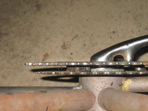 El espacio entre los dos piñones no fue suficiente y ahora las dos cadenas frotan un poco donde cruzan. No es suficiente hacer que aunque se unen. Me conformé con destrozando la rueda trasera (con una velocidad de tres internos) para tratar de pasar sobre el eje. Que resultó para ser un enorme dolor de cabeza y forma de lo que esperaba. En retrospectiva, debo han permitido más espacio entre las ruedas dentadas. Otra idea es un tándem en una tienda de bicicletas local y medir las distancias entre sus piñones, que tiene una unidad del mismo lado.