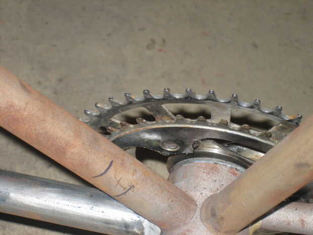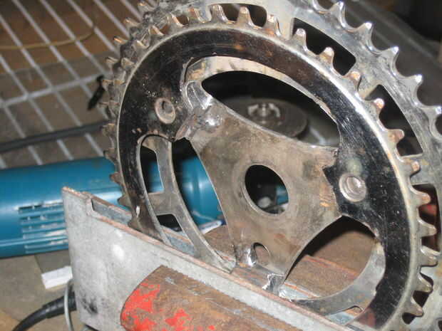 Para añadir un anillo de piñón a las manivelas de una sola pieza medido hacia fuera la cantidad mínima de espacio que necesitaría para que las dos cadenas a claro. Intenté usando tornillos y tuercas a unirse a ellos, pero que hacen demasiado voluminosa. Mi vecino y he encontrado algunas piezas de acero finos que le espacio a la derecha por lo que sueldan los piñones y los distanciadores. Luego fui a las soldaduras con una amoladora dremel para limpiar para arriba.
