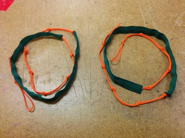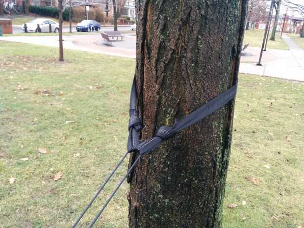 Después de algunos experimentos, he encontrado que el método de cadena de la cuerda no es lo suficientemente versátil. He creado nuevo árbol correas hugger de 5' 1" de las correas, con nudos de rizo simple para crear lazos en ambos extremos, y lazos de una longitud de ~ 15' de paracord de la hamaca, fijar con un nudo tensor como un enganche de balanceo o un enganche de camioneros.