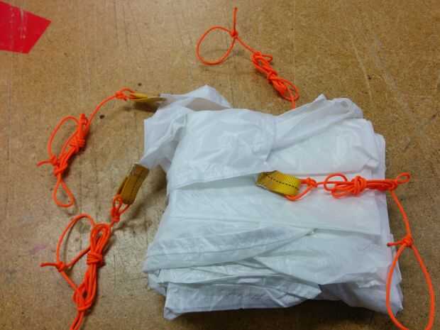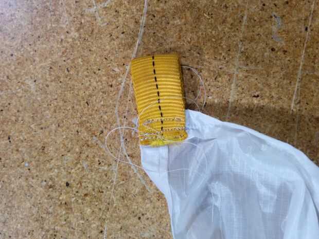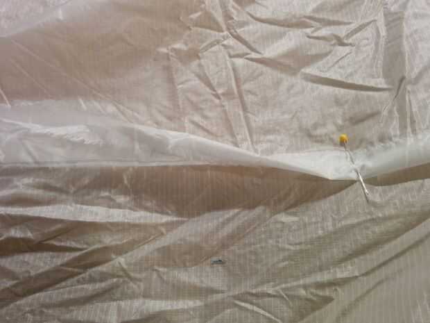 Para hacer un toldo lo suficiente, cosieron una piezas anchas 5' y 2,5'. Esto crea una costura offset (no quería que la costura directamente encima de la hamaca por temor a fugas). Entonces había cercado todo y añade 2" bucles de cinta en las esquinas. Corte una longitud de paracord 20' - 25' para la suspensión de la mosca y lavar todo en líquido de intemperie.