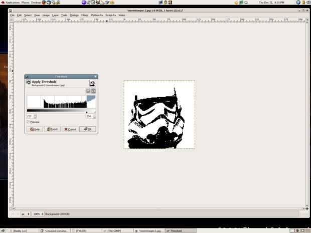 Al usar la herramienta umbral (Herramientas > herramientas de Color > umbral) querrá jugar con los ajustes para obtener buena duro blanco y negro, que es perfecto para estarcir.