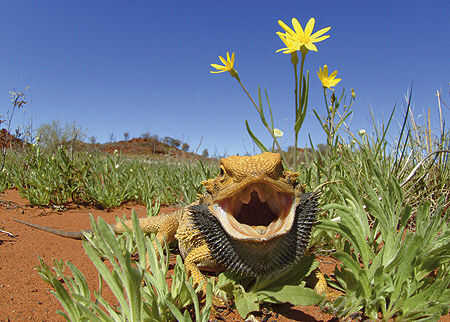 Dragones barbudos llevan el nombre de la bolsa distintiva en la parte inferior de su mandíbula, cuando amenazó a inhalar aire y soplo la bolsa con el fin de aparecer más grandes.