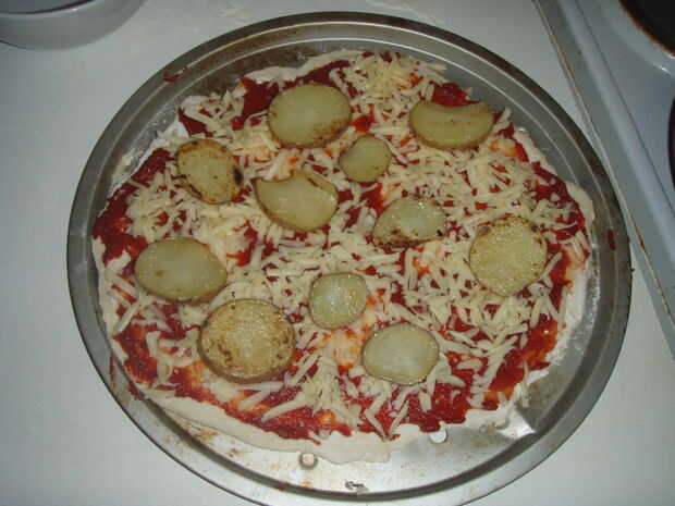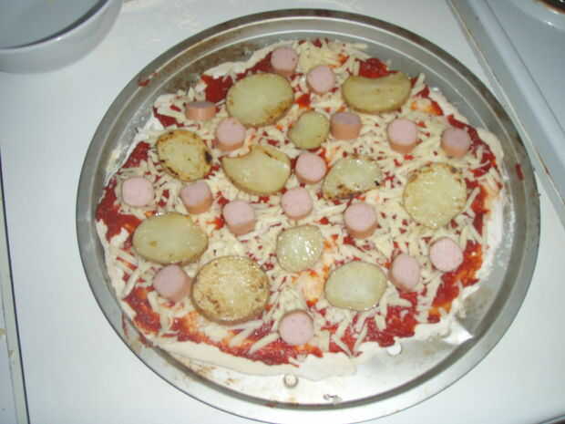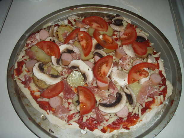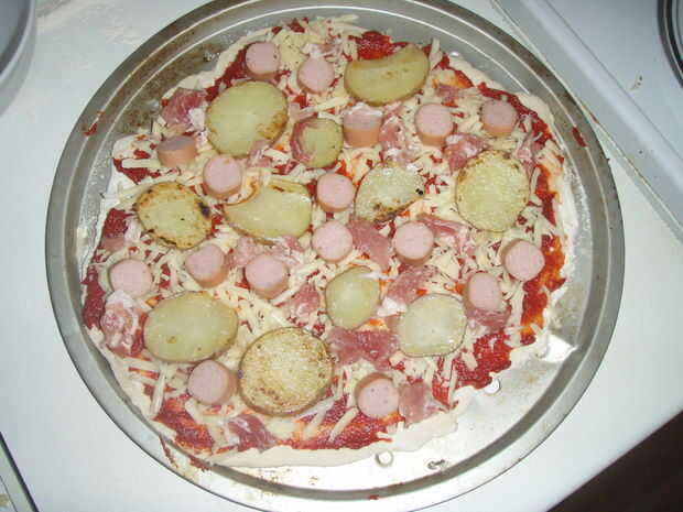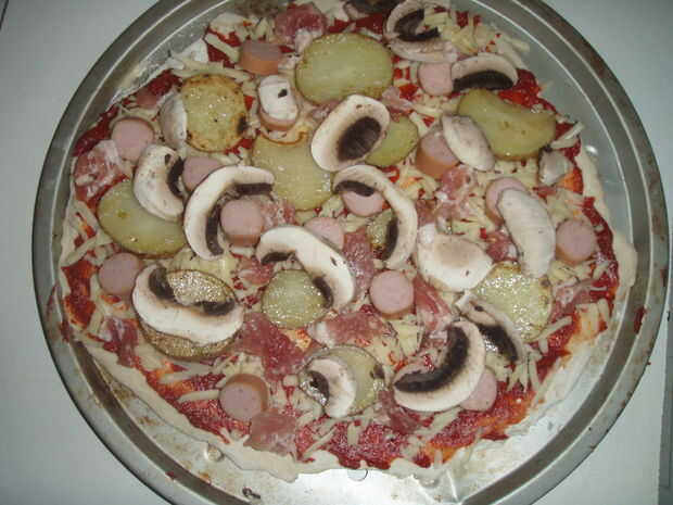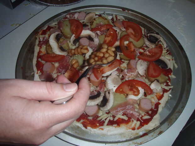 En primer lugar que usted necesita extender el puré de tomate por toda la pizza base, luego Espolvoree el queso hacia fuera uniformemente. Añadir el resto de los ingredientes uno por uno, primero las patatas, luego la salchichas, bacon, champiñones, tomates y habas cocidas al horno.