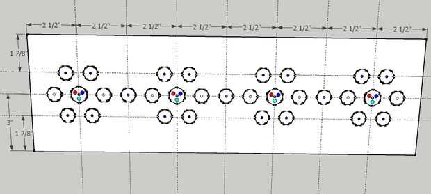Utilizando el principio de diseño (cuadro de referencia 1) con los 3 LEDs. Hay cuatro 3-Up LED, y serán colocados en la línea de centro horizontal y distribuidas uniformemente. La primera hasta de 3 en 3" y más 2 1/2" cruce a la izquierda. Siguiendo horizontalmente en la línea 3" guía, coloque otro 3-hasta cada 5" (saltar cada otros 2 1/2" vertical pauta).