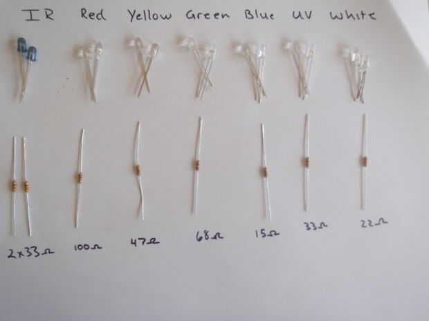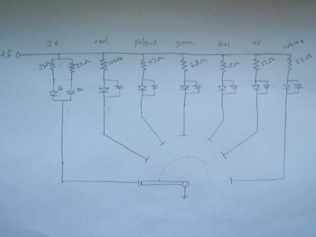 Echale un esquema para que sepas lo que los cables van a qué componente. Desde que sólo era capaz de encontrar un interruptor de 6 posición tuve que elegir sólo seis colores a utilizar. Elegí IR, rojo, verde, azul, UV y blanco. Sé que me faltan algunos colores para que sea un espectro completo absoluto, pero usted puede agregar más LED de si desea.