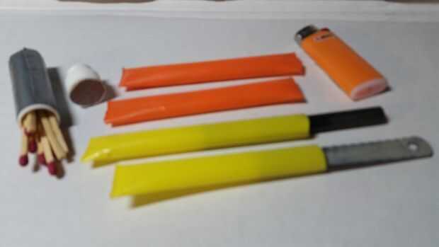 La hoja de varilla y Sierra de Ferrocerium se almacenan en pajitas jumbos, sellado en un extremo sólo por lo que se quitan fácilmente y no rasgarán el bolso del almacenaje del calor. Estas y las bolas de algodón se colocan en una bolsa estilo cremallera pequeño,