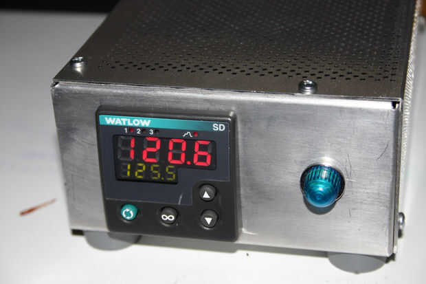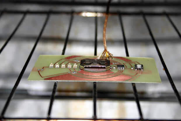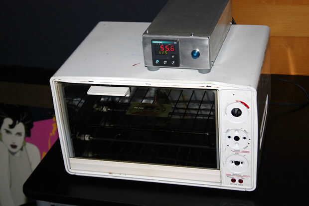 Una vez tengas el horno programado, coloque la Junta en el centro de la rejilla, asegurándose de que el termopar es cerca de la superficie del PCB, por lo que puede obtener una lectura que cerca de las condiciones reales de los empalmes de la soldadura. Cierre la puerta y arrancar el programa. Extintor cerca, por supuesto.