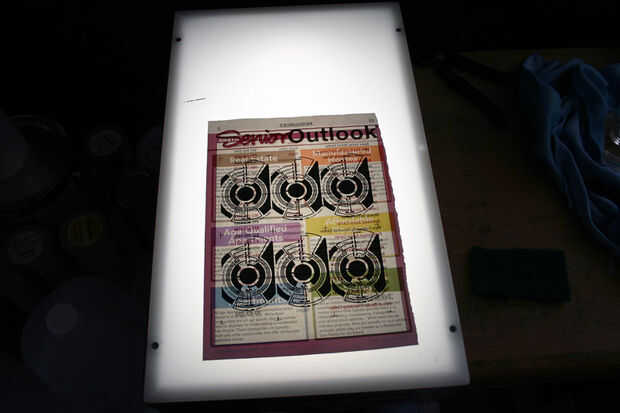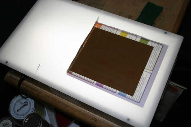 Una vez que la transferencia es impreso, necesita a su PCB precortado para sus marcas de alineación en el papel de transferencia, lateral de toner al cobre. Aquí realmente ayuda a tener una mesa de luz para que pueda ver aunque el papel de transferencia. Doble sobre una orilla de la transferencia, lo doble, asegúrese de que no mueva e introducir el extremo arrugado en el laminador precalentado. No he notado diferencias en la adherencia basada en papel de transferencia sobre el rodillo inferior o del rodillo superior, aunque utilizar PCB muy fina. Usted puede notar una diferencia para los PCB más grueso.