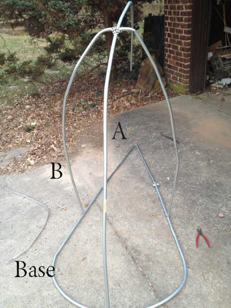 Después de ese pedazo está doblado, tomar uno más largo y doble en un forma de U al revés. Esto va en el centro y levante la pieza anterior y es B. Esta pieza debe ser aproximadamente 4 pies de altura y curva con 3 pies entre cada poste.