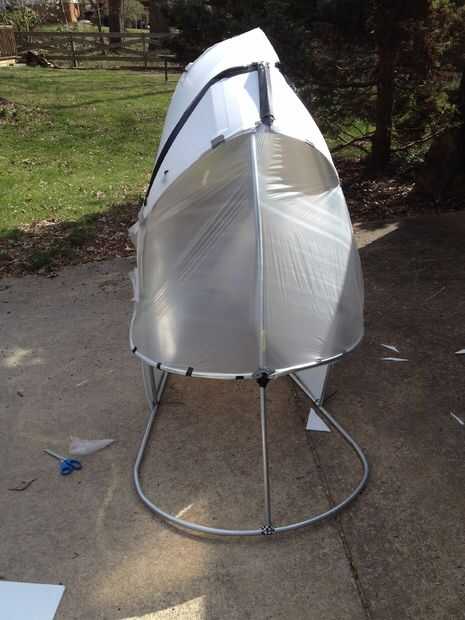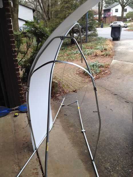 El siguiente paso es colocar el Coroplast en el armazón. Usé zip lazos para sujetar las piezas juntas en el marco. Yo también conducto con cinta las costuras por lo que sería menos el cambio entre las diferentes alturas del coroplast. Mostrado también se une la tela del pintor como un parabrisas, este no fue utilizado en el producto final porque realmente realmente no puede ver a través de él. Coroplast puede encontrarse en la mayoría de las tiendas Home Depot o Lowe, pero necesita varias piezas puesto para cubrir toda la zona y las piezas bastante la curva.