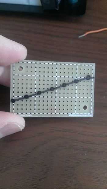Conseguir un pedazo de chatarra perfboard, placa perforada o lo que sea. Todo lo que importa es que la Junta ser perforado con los agujeros normal 0,1" espaciados. Tomar un marcador y un punto en los orificios que va a utilizar. Sugiero una pendiente de 1/3 como he mostrado aquí. En otras palabras, toma el primer lugar que se desea medir una resistencia, probablemente 4 o 5 agujeros, luego paso en tres y uno. Haga una marca en ese punto y mantiene móvil 3 y 1, marca los agujeros, hasta llegar a la curva más larga tendrá siempre quiere hacer. Una vez que tenga los agujeros deseados marcados, conéctelas con una línea.
