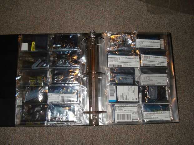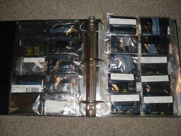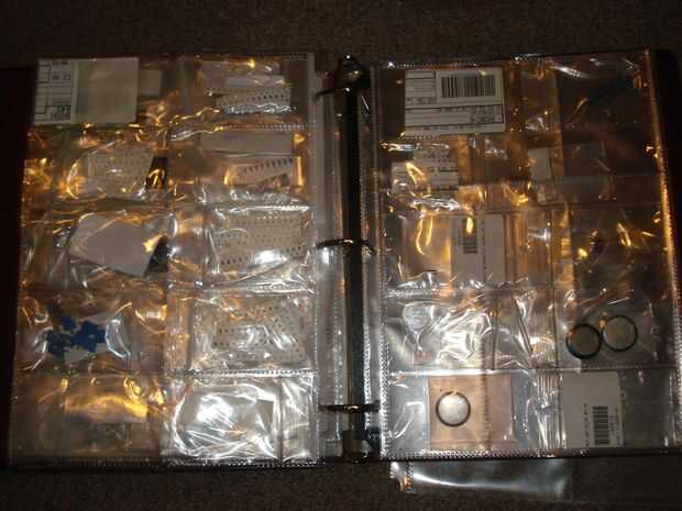 Poner los componentes en las bolsas zip-lock y pegar una etiqueta dentro de la bolsa. Luego coloque las bolsas dentro de los titulares de tarjeta de visita. Luego coloque los titulares de tarjeta en la carpeta de 3 anillos. Ordenar sin embargo te gusta.