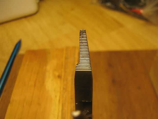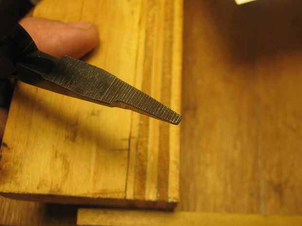 Utilice la rueda de amolar de la amoladora de banco para quitar el cono a un lado de las pinzas de punta de aguja. No pude tomar una foto de esto. Sólo está quitando una pequeña cantidad de material de las fauces. Sujete las pinzas firmemente a lo largo del resto de la amoladora de banco. Revise a menudo para verificar la eliminación incluso de material.