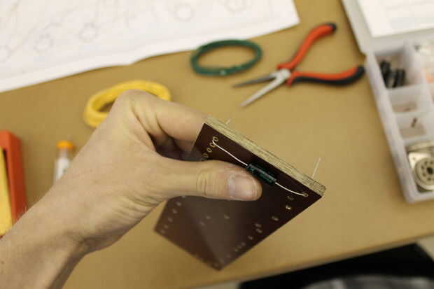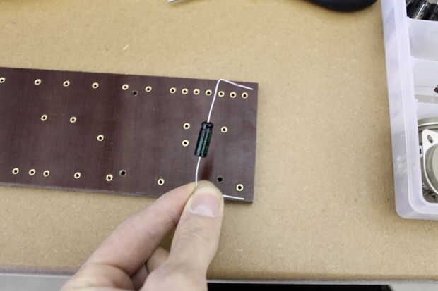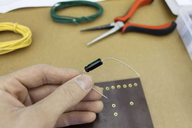 Siguiendo el diagrama, la primera parte que necesitaba instalar era un condensador. Estos están polarizados y pueden ser complicados. Esta tapa especial tenía el extremo doblado y un + lado marcado en un extremo. Usando el diagrama, determina la posición correcta.