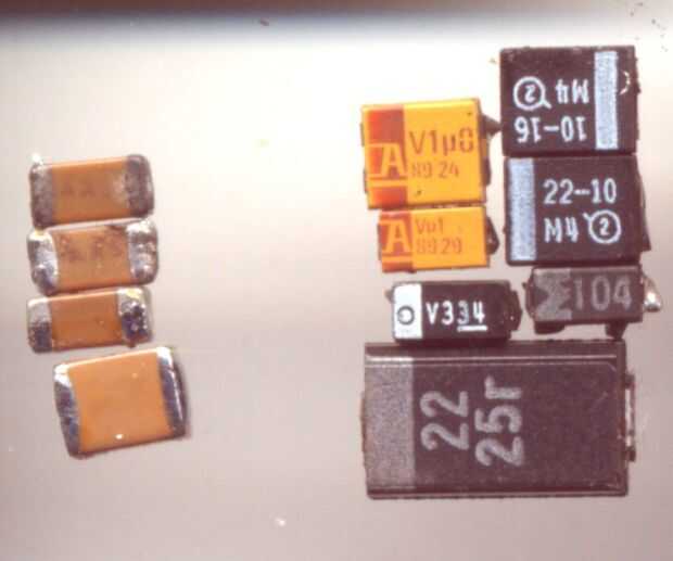 A la izquierda de la imagen son los condensadores de cerámica - profesionalizados - abreviatura de Multi capa de cerámica - generalmente son este color marrón, aunque he visto blanco y negro, y los extremos como si sumergido en metal. No hay generalmente marcas, por lo que la medición es la única manera de clasificarlos.