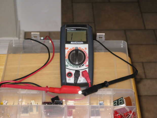 Prueba de LEDs de luz visibles es fácil en un multimetro, ajustar el medidor para comprobar la continuidad; Cuando el LED está conectado remite sesgo (el cátodo está conectado a tierra) se ilumina el LED. Mi multímetro estaba preparado para 200 ohm.
