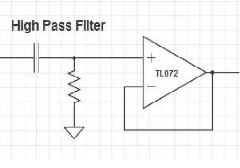 Utilizamos un 10 nF condensador y resistencia de 100 kOhm para hacer el filtro de paso alto. La AD5933 suministra un voltaje de 2V. El código de programas para realizar un barrido de frecuencia de 50 kHz a 50,5 kHz. El filtro está diseñado para atenuar el ruido en frecuencias por debajo del rango del barrido. Un seguidor de voltaje se incluyó para evitar la resistencia de ajuste de corriente de carga del filtro.