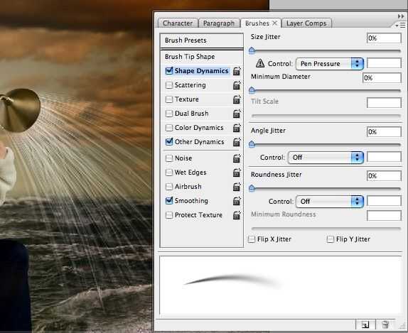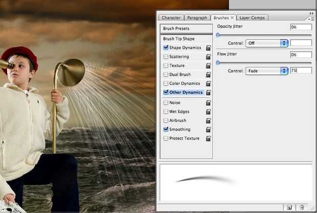 He utilizado un cepillo muy suave en una capa en blanco, con el tamaño de forma dinámica la inquietud con presión 0% y la pluma conjunto en blanco, y otras dinámicas > flujo jitter a 0% y el control de fade y 75.