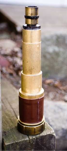 Es simplemente un compresión tubería kit de reparación que descubrí mientras paseando por la sección de pvc de mi tienda local renovación casera. He añadido una extensión de tubo para el ocular, pintado negro y oro y añadido una tira de piel artificial barato vinilo para el agarre.