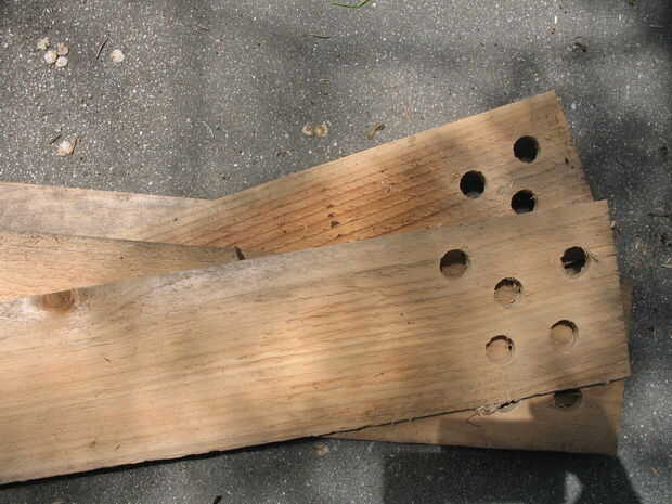 Agujeros de taladro 1" a 6" del extremo de cada tabla. Estas aberturas permitirán los gusanos a ir - comer sobras de la cocina en el café y luego recorriendo el jardín dejando piezas fundidas y aireación del suelo.