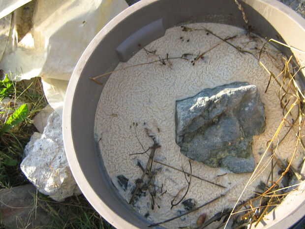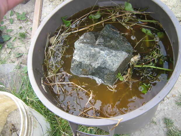 Bueno, llegué a casa del trabajo un día y el heno tenía atrapadas las burbujas de CO2 de la levadura, levantado a la superficie y empuja la tapa de la lata. Así que puse en una gran roca sobre el heno para mantenerlo hacia abajo. Yo esperaba que se hunden lentamente pero no.