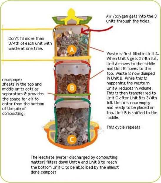 Pila de macetas uno sobre el otro. Asegúrese de que el bote de fondo (pote C) siendo la olla sin el agujero en la parte inferior.   Poner una capa de periódico en el pote A y pote B para que no deje caer los materiales que no sean agua en las capas de abajo.   Cubrir el compostador con la tapa de terracota para evitar roedores o moscas.   Tu compostador está listo para compostar. Poner al compostador en un lugar ventilado como jardín o terraza para aumentar la circulación de aire este creciente proceso de compostaje.