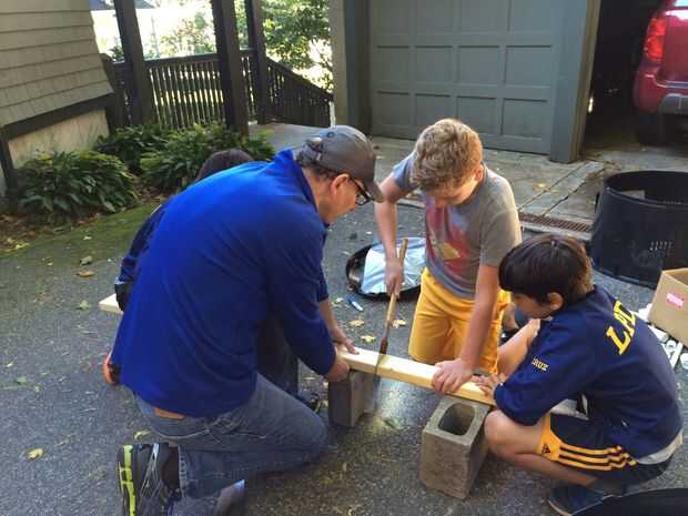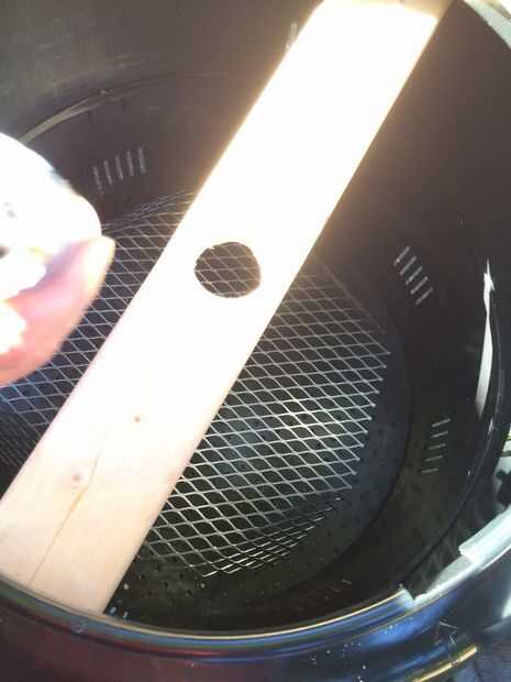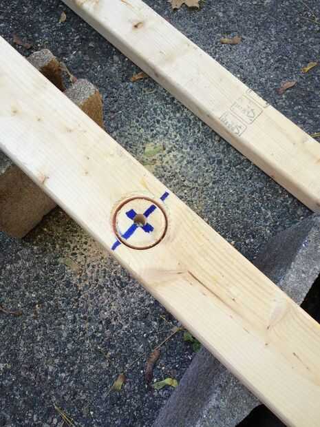 Cortar las patas de 2 x 4 a 2 largo y luego poner la pieza de madera en la parte superior de la compostera. Perfore un agujero a través del centro de la pieza de 2 x 4 de madera (haga el orificio en las madera 2,25 pulgadas de diámetro) por lo que el motor puede caber a través de él.