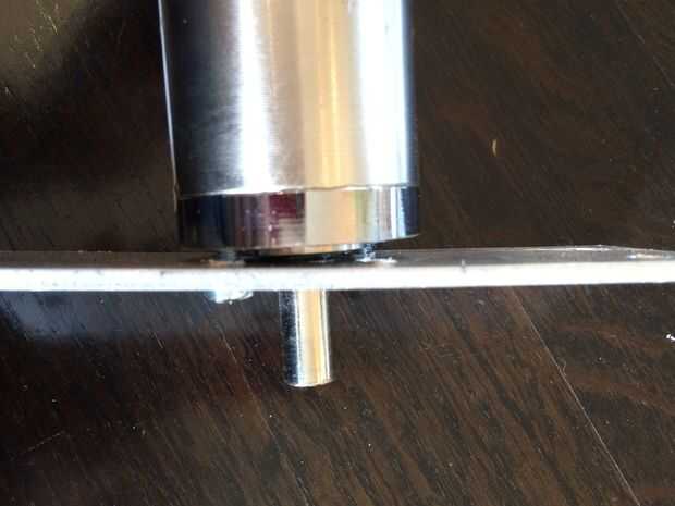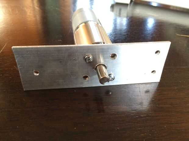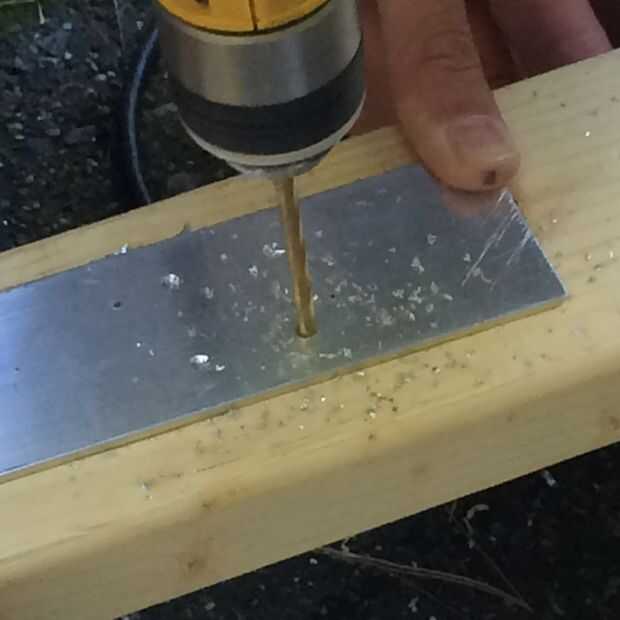 Corte de aluminio para 5 1/2 pulgada de largo, ⅛ de grosor y 2 pulgadas de ancho. Vamos a conectar el motor a la hoja de aluminio para Sujete a la madera. Consulte el cuadro de mediciones, para perforar los agujeros. Tornillo de la hoja del motor en dos lugares. Luego abajo a la madera.