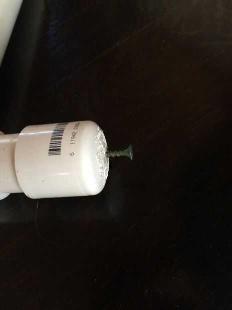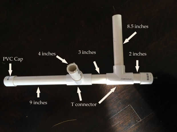 A continuación haremos el turner. Corte el tubo de PVC de 9 pulgadas, 4 pulgadas, 8 1/2 pulgadas, 3 pulgadas y 2 pulgadas. Ajustar las diferentes tuberías de la imagen como se muestra. Atornillar el casquillo de eje en la tapa de PVC, como se muestra arriba. Atornillar un tornillo en una tapa de PVC, por lo que aferra a la rejilla metálica para mantener vertical la turner. Coloque los 2 conectores de PVC T como se muestra arriba. Fijar todas estas características con pegamento de PVC.