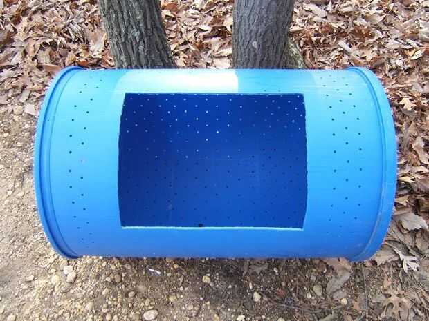 Luego, usando una sierra rotativa, corte una puerta rectangular en cada barril. Tenga cuidado de que la puerta es lo suficientemente grande como para permitir el acceso cómodo al interior del cañón.