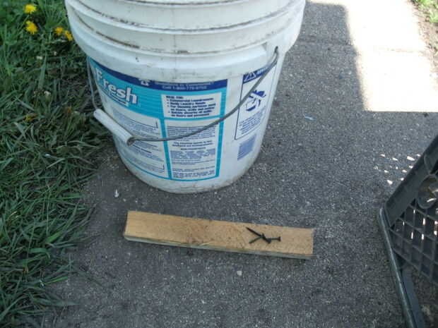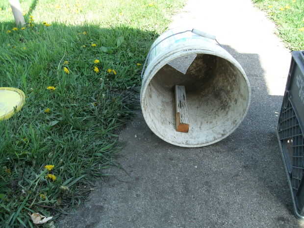 Cortar la pieza de madera de 2 x 2 tiempo suficiente para la remoción de la tapa y atornillar en el interior del cubo con tornillos que roca hoja desde el exterior de la cubeta en.   Se trata del agitador para el compostador.
